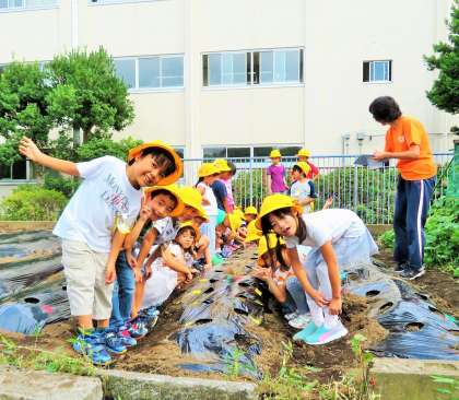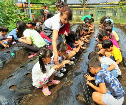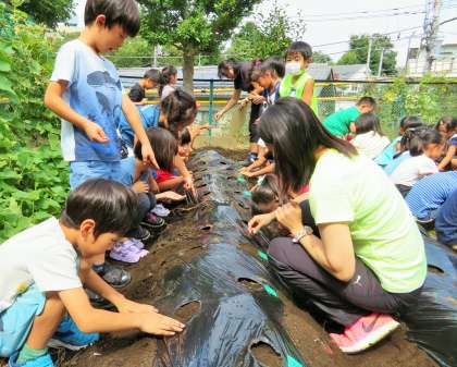 「砧っ子農園」で大根の種植えが始まりました。先生から大根の種を3粒ずつもらい、3つの穴をあけて植えました。「はやく芽が出てこないかな!」そんな声が聞こえてきます。11月頃に収穫ができるよう育てていきます。