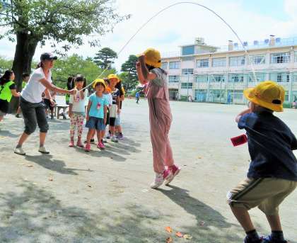 砧小学校の特色の一つに、休み時間は先生との「共遊び」があります。クラスのみんなで楽しく遊んでいました。ドッジボール、長縄跳び、こおり鬼など、休み時間は嬉しそうな顔が校庭にいっぱい広がっています。