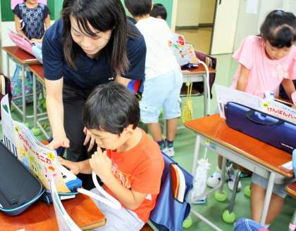 担任が全体、個別指導を行っていますが、指づかいを友達から教わっている子もいます。演奏の得意な友達が担任を待っている間に教えてあげています。教え方がとてもやさしく、友達ができると自分のことのように喜んでいます。このような小さなかかわり合いが学級を育てていきます。