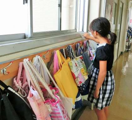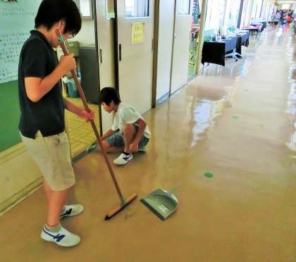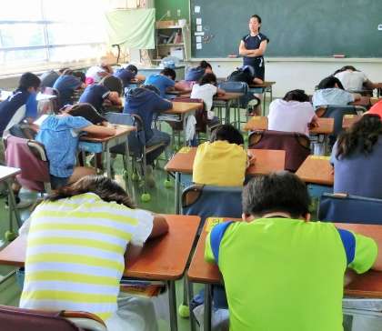 お掃除の前に、担任の先生とめあての確認、目を閉じて心を整えています。