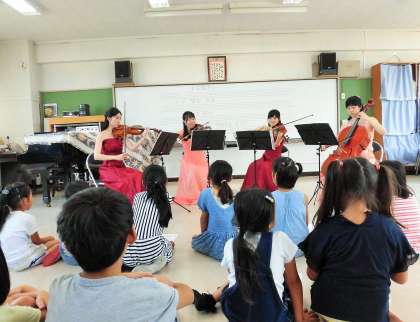 今日の午後は、PTA家庭教育委員会主催の「音楽鑑賞会」です。弦楽四重奏『アルコ』の皆さんに来ていただきました。第1、第2バイオリン、ビオラ、チェロの四つの弦楽器による、美しいコレボレーションに惹きつけられ心を癒されました。