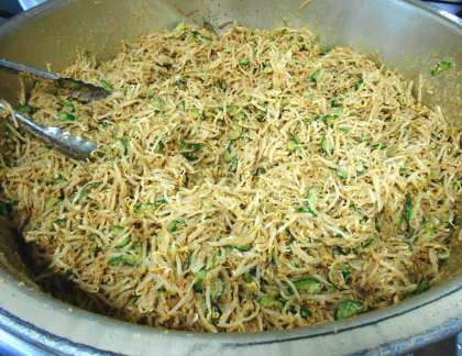 今日の給食の副菜は、<ごま酢かけ>です。ゆでた野菜にすりごまと調味料をあわせて作ります。ごまの香りが食欲をそそります。和風の味付けですが、砧小の子どもたちに人気のある和えものです。