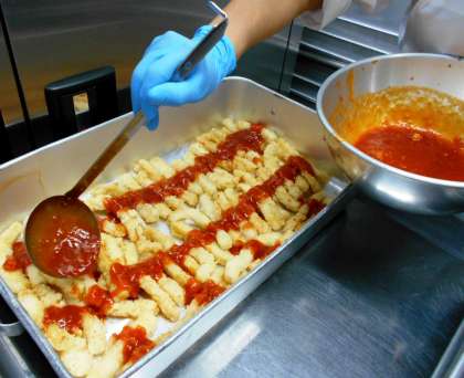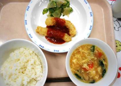 今日の給食の主食は、<いかのチリソース>です。片栗粉をまぶして揚げたいかに、ピリっと辛いチリソースをかけました。白いごはんのすすむ味付けで、子どもたちもよく食べていました。白いごはんとおかずを交互に食べるようになってほしいと思います。