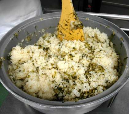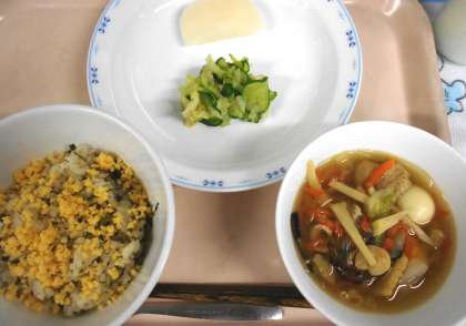 毎月19日は、食育の日です。今月は、熊本県の郷土料理である熊本でとれた高菜を使った<高菜めし>、魚介や春雨・野菜がたっぷり入ったスープ<タイピーエン>を作りました。図書室前には、熊本県に関する本が展示され、「熊本県の形はどれでしょう?」というクイズに興味をもってみている子もたくさんいました。子どもたちには、郷土料理をきっかけに、自国の文化にも目を向けてほしいと思います。