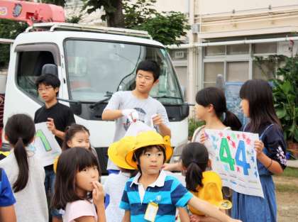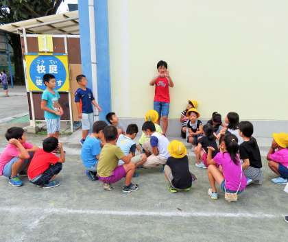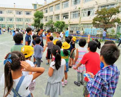 今朝の朝遊びは、縦割りの班で、6年生65人がすべて班長となる『新なかよし班活動』の実質第3回目です。それぞれの班の待ち合わせ場所に、集合する時間が少しづつ早くなってきました。班ごとに作成した旗が目印になっています。
