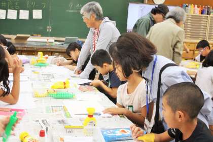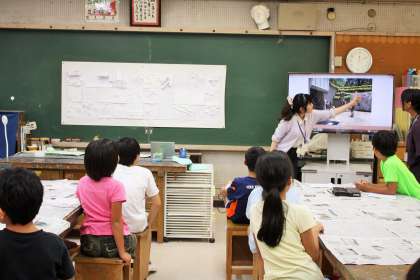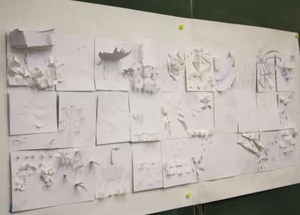 4年生美術鑑賞教室出張授業では、一人一人が「夏の思い出」をテーマにレリーフを作りました。材料は白い紙とのりのみ。鑑賞リーダーさんやサポーターさんたちに表現のヒントをいただきながら、自分の夏の思い出を表現していました。白一色でありながらも、立体的で、一人一人の個性が光る作品ができあがりました。