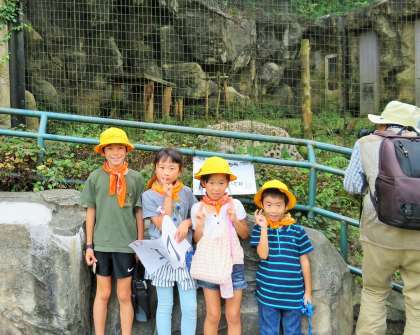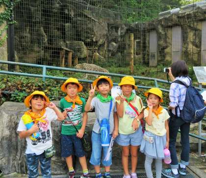 1・2年生は、どんなことにも興味があり、意欲いっぱいの子どもたちですので、動物園は宝の山のようでした。ユキヒョウをバックに写真を撮りました。