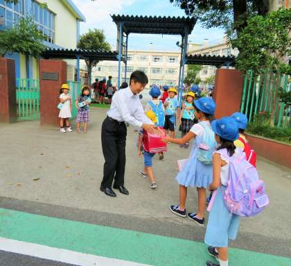 今朝は1年生の子どもたちが、正門と玄関の昇降口であいさつ運動を行いました。このまま、毎日一緒にあいさつをしてほしいと思えるさわやかな「あいさつ隊」でした。