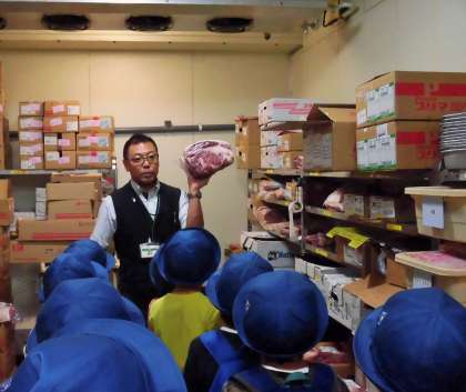 まずは、精肉コーナーの裏側です。肉をカットしたり、ひき肉をひいたりする仕事です。産地や鮮度にこだわって、毎日新鮮な商品を提供していることがわかりました。