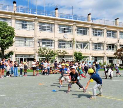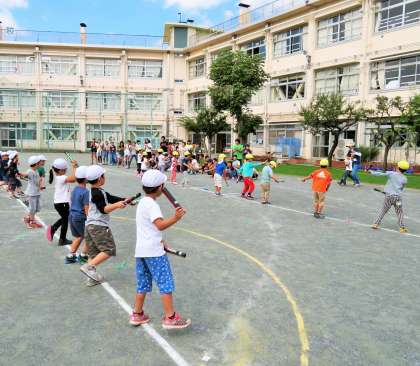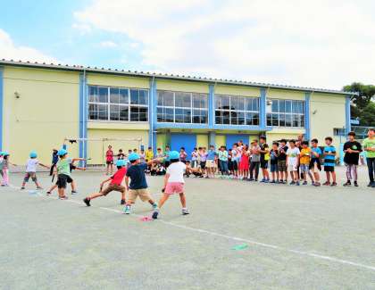 5年生と砧幼稚園の年長星組が、10月11日の「幼・小交流稲刈り」に向けて、交流会を行いました。まずは、年長星組さんが運動会で行う演技を披露しました。5年生は、リズムに合わせて手拍子を打ったり拍手をしたりして盛り上げていました。