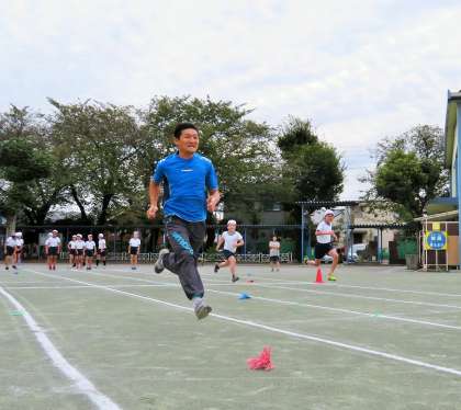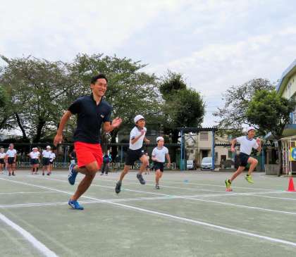 先生たちも、子どもたちと一緒に走りながら鼓舞しています。