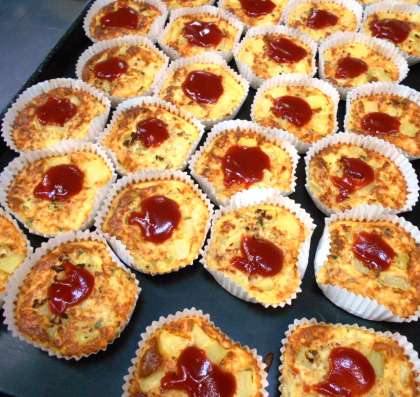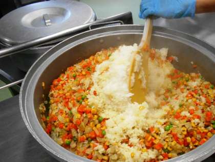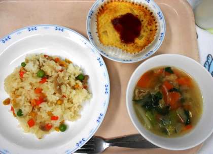 今日の主菜は、<スペイン風オムレツ>です。給食では、じゃがいも、玉ねぎ、鶏ひき肉をいためて荒熱をとり、卵とあわせてオーブンで焼いて作ります。ケチャップもかけて、色鮮やかな仕上がりです。