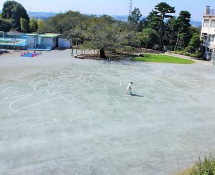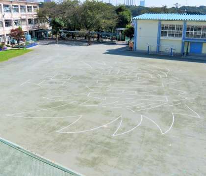 今日は、砧小学校の創立115周年を記念して航空写真を撮影しました。お天気もよく絶好の撮影日和です。航空写真のデザイン画は、4・5・6年生に募集した中から、全校児童の投票により選ばれた作品です。