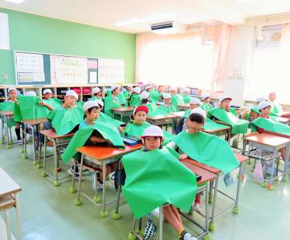 子どもたちと教職員は、指定されたカラーエプロンを着用して準備万端です。