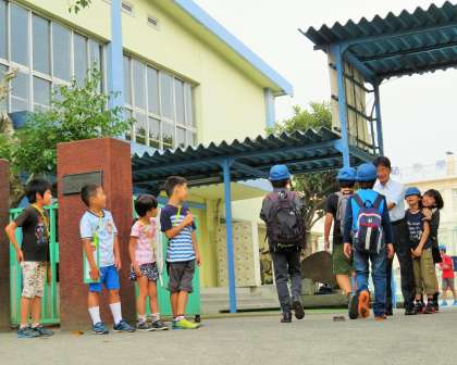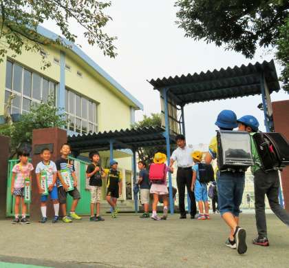 今日も2年生の子どもたちが正門と幼稚園門で、気持ちを込めたあいさつ運動を行っています。今日からは、手作りの「たすき」をかけて活動しています。