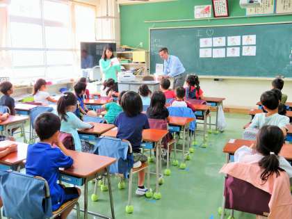1年生の英語活動は、ジェフ先生と担任の先生との授業です。ピクチャーカードに描かれているスポーツの単(Basketball,Soccer,Golf,Baseball,Badminton,Dodgeball,Tennis)の発音練習を繰り返し行いました。その後、覚えた単語を使ってペアでジェスチャーゲームをしました。子どもたちは、友達にからだを使ってそのスポーツを表現して、相手の友達に英語でスポーツの名前を当ててもらい大喜びでした。最後は、ジェフ先生に、何人もの子どもがジェスチャーで単語を表現し、楽しく英語活動に親しみました。