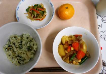 今日の副菜は、リクエストのあった<梅ドレサラダ>です。かりかり梅を使って作るドレッシングがポイントです。教室をまわっていると、「今日のサラダ、とてもおいしかったです。」「小さな梅干しが入っていて、嬉しい!」と砧小のこどもたちは梅干し好きな子が多いようで、喜んで食べていました。梅干しは酸味はありますが、体を元気にしてくれる食材です。梅ドレサラダをもりもり食べて、砧小のこどもたちは元気いっぱいに過ごしていました。