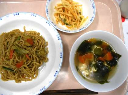 今日の主菜は、<カレー風味焼きそば>です。ソース味の焼きそばにカレー粉で風味をつけました。教室をまわっていると、「カレーの香りがして、おいしかったです。」「カレー味のものを食べると元気がでます!」と話している子もいました。