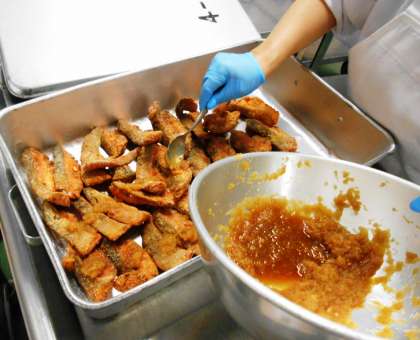 今日の主菜は、<鮭のおろしたき>です。小麦粉と片栗粉をまぶして、油で揚げた鮭に大根おろしのソースをかけました。大根おろしが苦手だという子どもたちも、チャレンジしていました。どの学級もよく食べていました。
