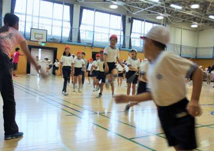 今日の体育朝会は2回目の長縄朝会です。雨のため、体育館で行いました。(1・2年生は明日実施します)