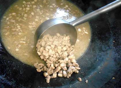 給食では、脂身の少ない豚肉を使用しているため、やわらかくなるように鶏がらスープと赤ワインで別に煮て、その煮汁ごとボルシチに加えています。