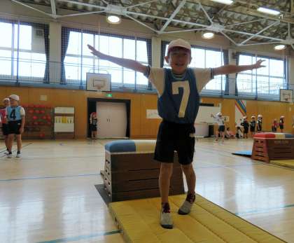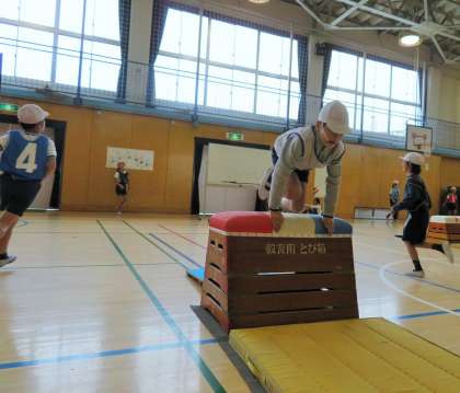 今日の4時間目に3年生、関谷教諭の体育研究授業がありました。前回の講師の先生(私です)の助言を生かした器械運動領域「跳び箱」の単元です。今できる技に取り組み、安定した動作で支持跳び越しができる、友達同士でアドバイスをし合うことができるというねらいをもっての学習です。