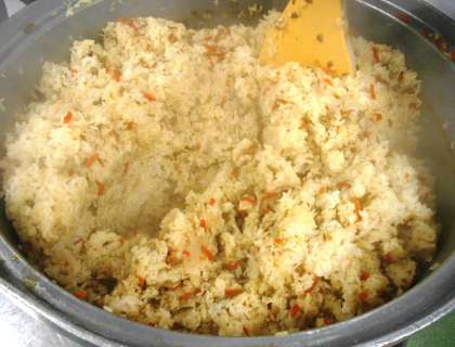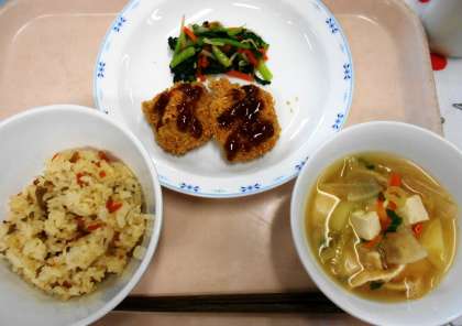 今日の給食の主食は、<とり肉とごぼうのごはん>です。ごぼうの香りが感じられる混ぜごはんです。ほんのり甘い味付けに仕上がりました。