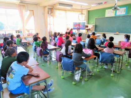 1年生は担任の先生が、ICT機器を活用して、今日このあと出発する「さつまいも掘り」の絵本の読み聞かせです。さらに、いも掘りが楽しみになってきました!