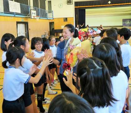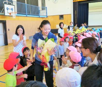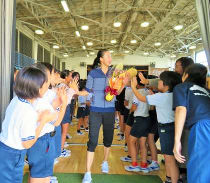畠山さんは、とっても明るく気さくな人柄で、子どもたちから大人気でした。このような交流を通して、「運動することの心地よさを感じてもらえたら嬉しいです!」、「砧のお子さんたちは、どうしてこんなに元気いっぱいなのですか!」と、驚かれていました。本物の選手に触れることで子どもたちの感性はさらに伸びました。