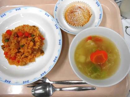 今日は、ハロウィンにちなんで、<かぼちゃのケーキ>を作りました。蒸したかぼちゃと米粉、ベーキングパウダー、豆乳、さとう、たまごを混ぜ合わせて焼き、粉糖をかけて仕上げました。「この白い粉はなに?」と聞いてきた子も多かったのですが、甘いさとうだとわかると安心したようで、喜んで食べていました。残食もとても少なかったです。