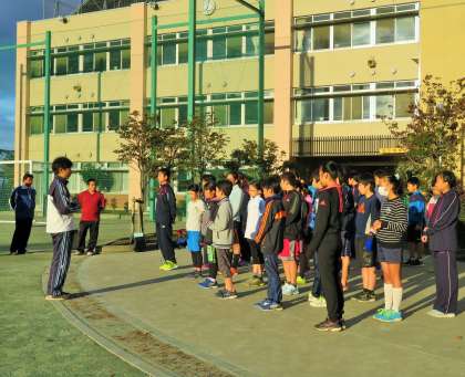 世田谷子ども駅伝に向けての朝練習3日目です。「砧の学び舎チーム」は、砧中学校、砧小学校、明正小学校、山野小学校から、小学生6名、中学生4名がチームを組み、たすきリレーをします。