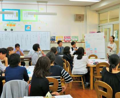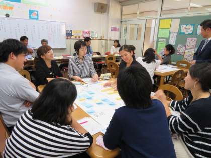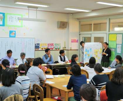 保護者の皆さんと教職員が一緒になってグループに分かれ、お話を聞いて感じたこと、両校長先生に聞いてみたいことを話し合い、それぞれのグループから発表がありました。