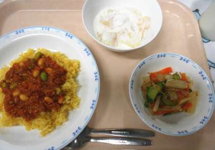 今日11月8日は、いい歯の日です。今日はよい歯をつくるために、大切なかむことをテーマにした<かみかみメニュー>を取り入れました。豆やじゃこ、するめいかといったかみごたえのある食材を使いました。デザートのヨーグルトには、歯を強くするカルシウムがたくさん入っています。子どもたち、今日はしっかりよくかんで食べていました。残食もとても少なかったです。
