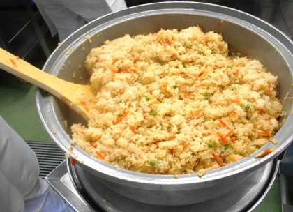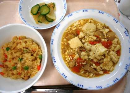 今日の主食は、<中華おこわ>です。干しえびや鶏肉・たけのこ・干ししいたけ・にんじん・グリンピースが入ったおこわです。「今日のごはんは、もちもちしていておいしいです。」と話してくれた子もいました。どの学級もよく食べていました。