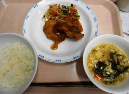 今日の主菜は、<みそかつ>です。とんかつの上に砧小特製の甘めのみそだれをかけて、いただきます。どの学年も、学芸会にむけて頑張っているのが、給食室にいてもわかります。今日は、頑張っている子どもたちを応援するメニューです。どの学級もよく食べていました。砧小特製の<みそかつ>パワーで、心をひとつにして、全力で頑張ってほしいと思います。