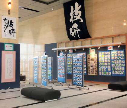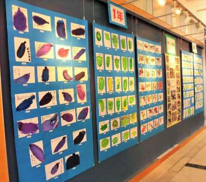 今日から、NHK技研ぎゃらりーにて絵手紙を展示しています。各学年が「砧っ子農園」で収穫したものを絵手紙にしました。