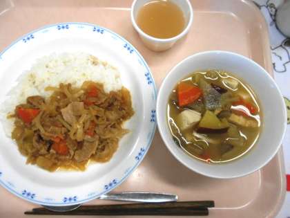 今日の給食は、学芸会応援メニューです。スタミナのつく豚肉を使った<おろし豚丼>と冷えた体をあたためる<さつま汁>、心を落ち着かせる甘さの<ももゼリー>です。