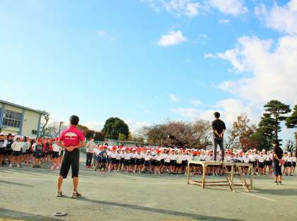 450人を超える子どもたちが一斉に走りますので、校庭には、低・中・高と3つのコースをつくり、先生たちが交通整理をしながらケガのないように努めています。