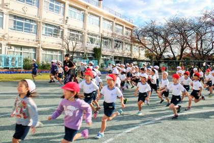 今年度からスタートした体育朝会、今日は持久走です。朝は寒さを感じましたが、子どもたちは元気よく走っていました。