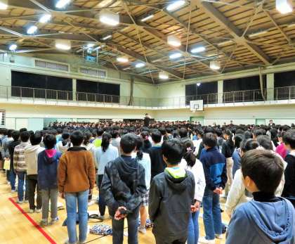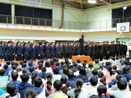 最後に、歓迎の歌ということで2年生全員による、合唱コンクール課題曲「時の旅人」を聞かせてもらい、「夢の世界を」を一緒に歌い、歌の交流をしました。中学生の真剣さと迫力ある歌声に感動です!