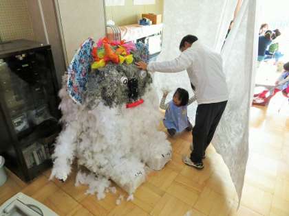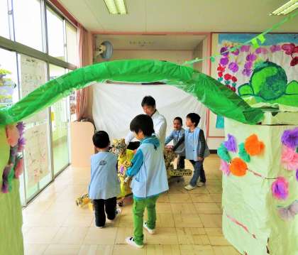 今日は砧幼稚園の「わくわくきぬたどうぶつえん」です。多摩動物公園遠足の後、遠足を振り返りながら、「コアラのふわふわなぞなぞ」「ユキヒョウのジャングルさんぽ」「トラのおなかのめいろ」「サイのわなげ」「ゾウくんランド〜えさをあげられるよ〜」など、5つのアトラクションを作りました。大型制作だけでなく雰囲気を盛り上げる小道具を作ったり、招待状チケットのカットや看板の絵を描いたりしながらお客さんに喜んでもらうための準備をしてきました。
