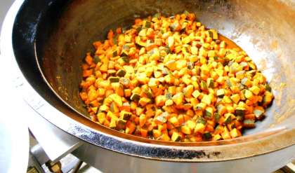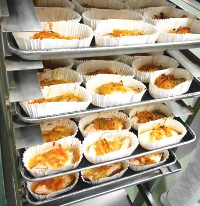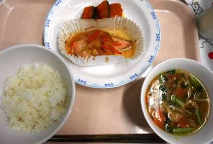 今日の給食の主菜は、<鮭のちゃんちゃん焼き>です。この料理は、鮭などの魚と野菜をみその味付けで焼いたもので、北海道の郷土料理です。今日はバターは使わずに、さっぱりとした味に仕上げました。