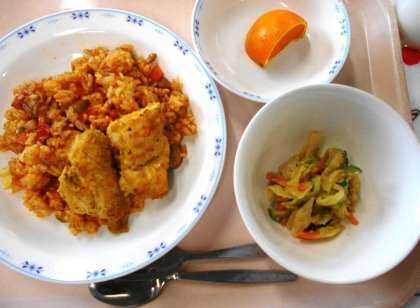 今日の給食の主食は、<ジャンバラヤ>です。ジャンバラヤはアメリカ南部のスパイスのきいた料理です。どの学級もよく食べていました。
