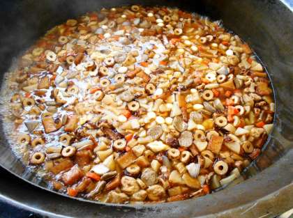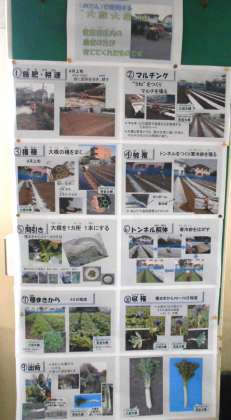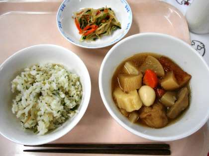 今日の給食は、せたがやそだちの大蔵大根の葉を使った<大根菜とじゃこのごはん>と、大蔵大根を使った<せたがやそだち大根のおでん>です。地産地消の取組です。