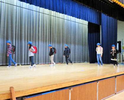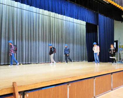 今日は集会委員会のゲーム集会で、「間違え探し集会」です。ステージ上の集会委員の子どもたちの様子を20秒だけ見ることができ、幕が閉じてしまいます。もう一度、幕が開いたときに、違っているところを3つ答えるゲームです。