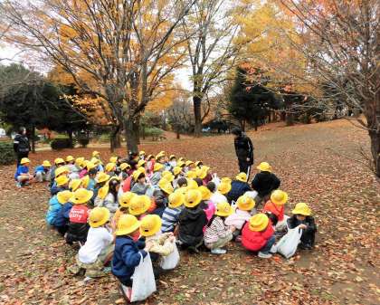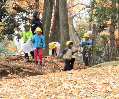 今日は1年生が次大夫堀公園に、生活科の学習で秋を探しに行きました。地面は落ち葉で覆われています。今日のテーマは「秋をさがしに」です。秋を感じさせてくれる落ち葉や、ドングリなどを拾いました。