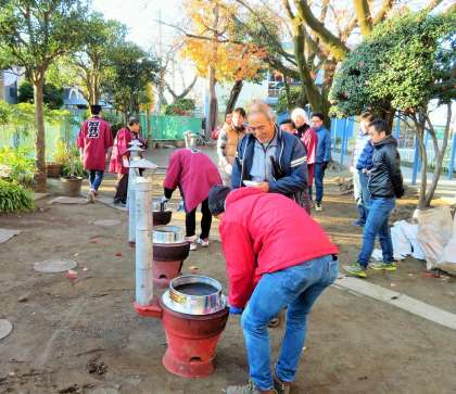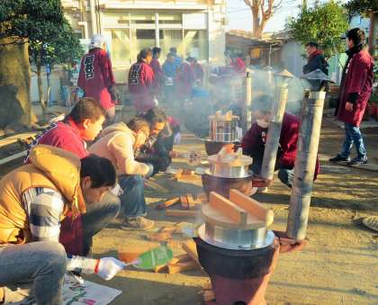 早朝7時30分からの準備で、かまどの湯気が立ち込める中、子どもたちは登校しました。蒸しあがったお米を見て歓声が上がっていました!かまどが6基、臼が5基も出ました。