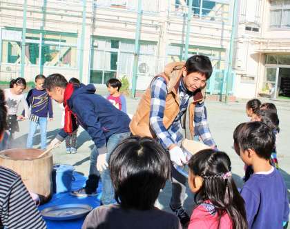 今日はさわやかな快晴で、気温もぐんぐんと上がり絶好のもちつき日和となりました。今年もたくさんの地域の方々、PTAの方々のご協力のもと、盛大にもちつき大会が開催されました。