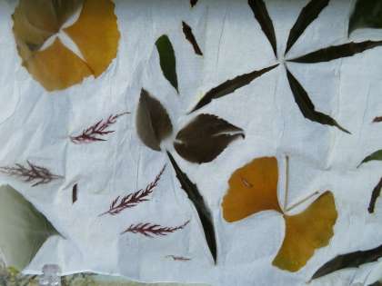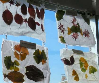 窓の側に飾ると、光に透けて、とても美しくいい感じです。子ども達は、嬉しそうに眺めていました。拾ってきた落ち葉を、すてきな紙に変身させて、秋を楽しむことができました。