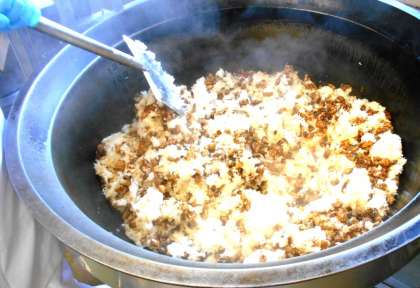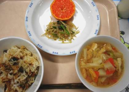 今日の主食は、<さんまごはん>です。さんまを油で揚げて、あまからのたれにからめ、ごはんに混ぜました。あまから味は人気のようで、どの学級もおかわりの列ができていました。「今日のごはん、おいしいです。」と話してくれた子も多かったです。